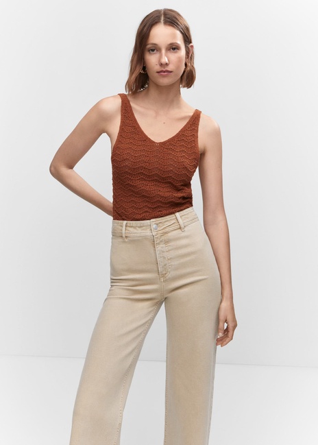 Розпродаж жіночих бежевих wide джинсів з блискавкою та кишенями виконаних у стилі Denim з колекції бренду Mango весна-літо 2024.
