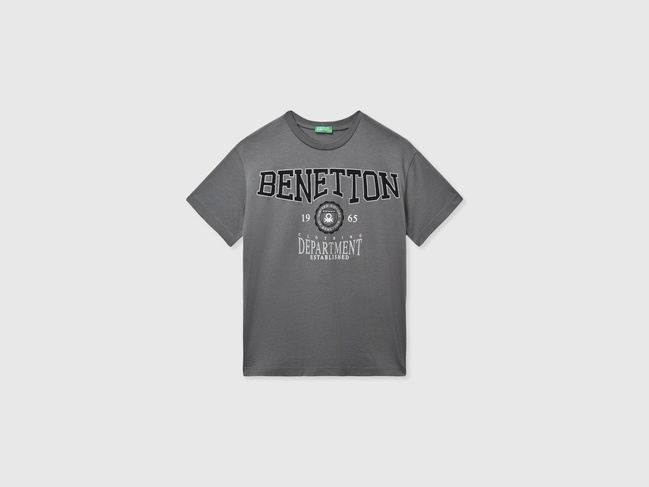 Розпродаж сірої прямої футболки з круглим вирізом для хлопчиків виконаної у стилі Casual з колекції бренду Benetton весна-літо 2025.