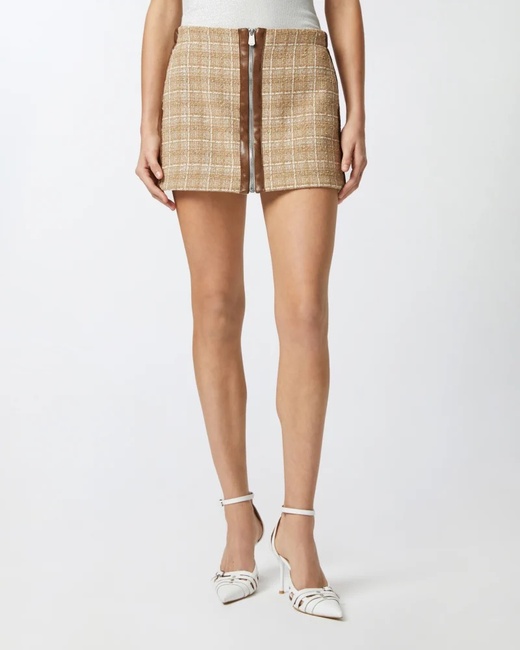 Розпродаж жіночої бежевої прямої спiдниці міні у клітинку з блискавкою виконаної у стилі преппи з колекції преміум бренду Pinko весна-літо 2025.