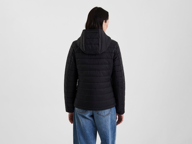 Розпродаж жіночої чорної прямої куртки з блискавкою та капюшоном виконаної у стилі Casual з колекції бренду Benetton весна-літо 2025.