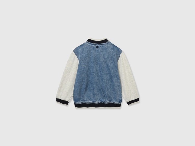Розпродаж синьої бомбера куртки з блискавкою але без капюшону для хлопчиків виконаної у стилі Casual з колекції бренду Benetton весна-літо 2025.