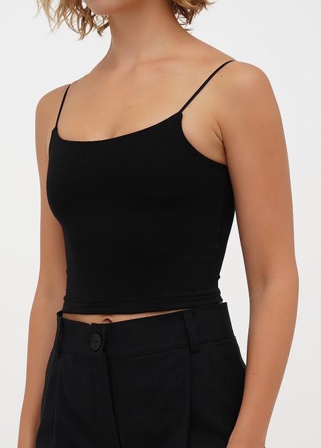 Розпродаж жіночого чорного прямого топа з тонкими брителями виконаний у стилі Casual з колекції бренду EQUILIBRI весна-літо 2025.