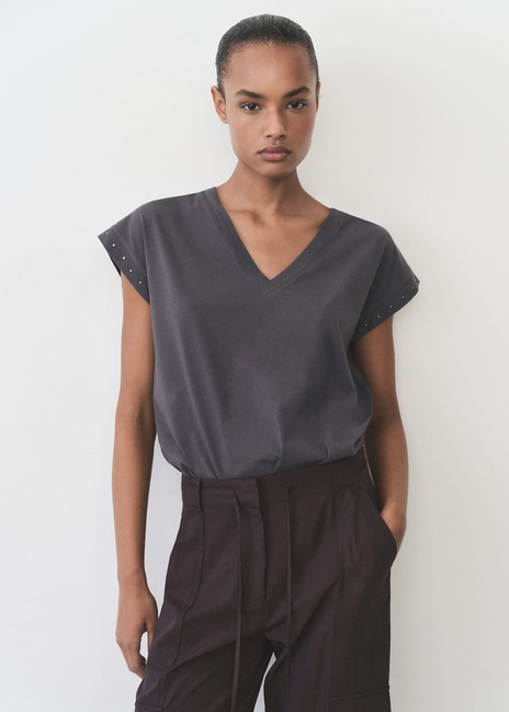 Розпродаж жіночої чорної прямої футболки з v-вирізом виконаної у стилі Casual з колекції бренду Mango весна-літо 2025.