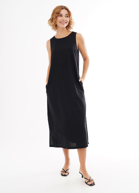 Розпродаж жіночої чорної прямої сукні з круглим вирізом та широкими брителями виконаної у стилі Casual з колекції бренду EQUILIBRI весна-літо 2025.