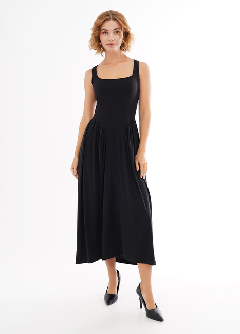 Розпродаж жіночої чорної кльошу сукні з широкими брителями виконаної у стилі Casual з колекції бренду EQUILIBRI весна-літо 2025.