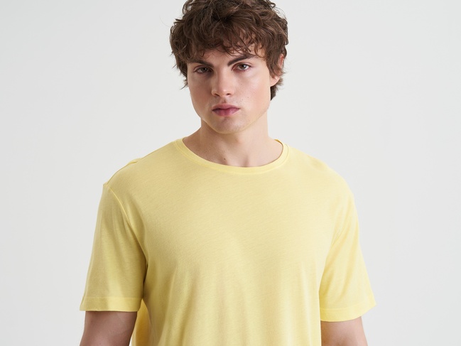 Розпродаж чоловічої жовтої прямої футболки з круглим вирізом виконаної у стилі Casual з колекції бренду Benetton весна-літо 2025.