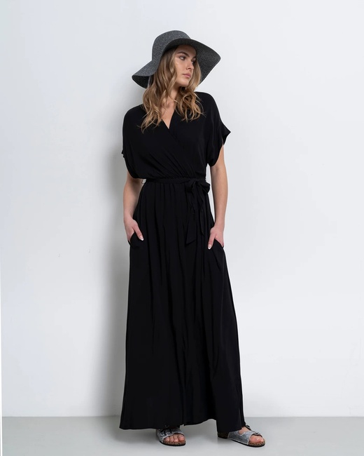 Розпродаж жіночої чорної на запахах сукні з v-вирізом та коротким рукавом виконаної у стилі Casual з колекції бренду Piazza Italia весна-літо 2025.