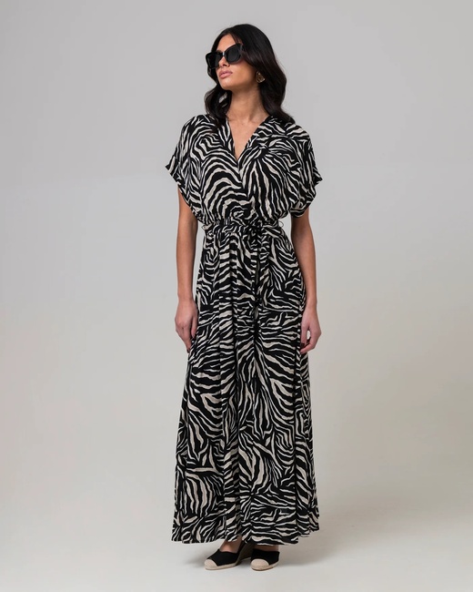 Розпродаж жіночої молочно-чорної зебрової на запахах сукні з v-вирізом та коротким рукавом виконаної у стилі Casual з колекції бренду Piazza Italia весна-літо 2025.