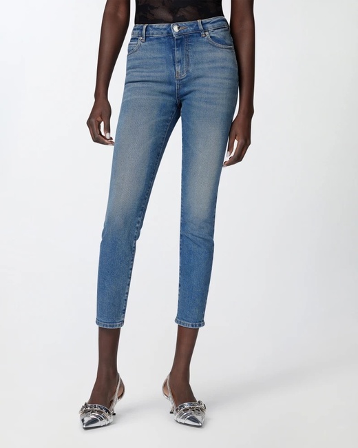 Розпродаж жіночих синіх skinny та укорочних джинсів з високою посадкою виконаних у стилі Denim з колекції преміум бренду Pinko весна-літо 2025.