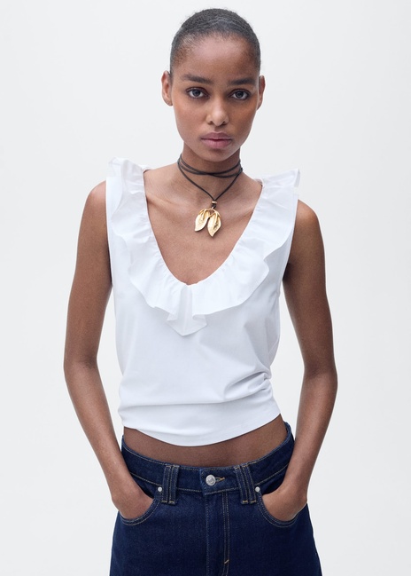 Розпродаж жіночого білого прямого топа з v-вирізом та широкими брителями виконаний у стилі Casual з колекції бренду Mango весна-літо 2025.