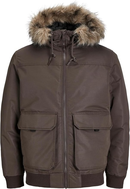 Распродажа мужской коричневой бомбера куртки с капюшоном и молнией выполненной в стиле Casual из коллекции бренда Jack & Jones осень-зима 2024.