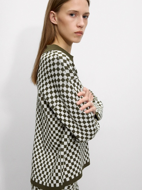 Новинка женского зеленого прямого свитера в клетку с v-вырезом выполнен в стиле Casual из коллекции бренда Parfois весна-лето 2025.