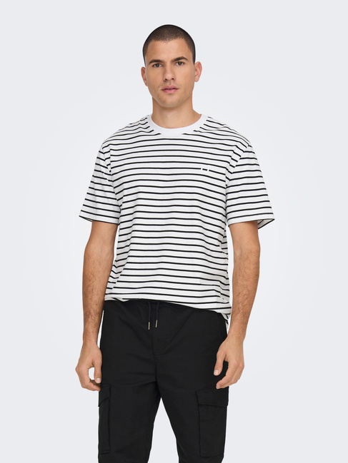 Распродажа мужской белой прямой футболки в горизонтальную полоску с круглым вырезом выполненной в стиле Casual из коллекции бренда ONLY & SONS весна-лето 2025.