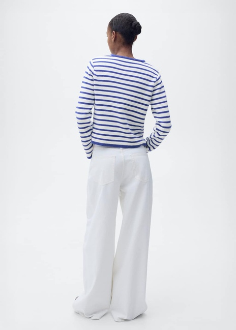 Распродажа женского голубого прямого кардигана в горизонтальную полоску с круглым вырезом и пуговицами выполнен в стиле Casual из коллекции бренда Mango весна-лето 2025.
