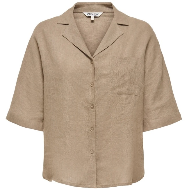 Распродажа женской коричневой прямой блузки с v-вырезом, коротким рукавом и пуговицами выполненной в стиле Casual из коллекции бренда Only весна-лето 2025.