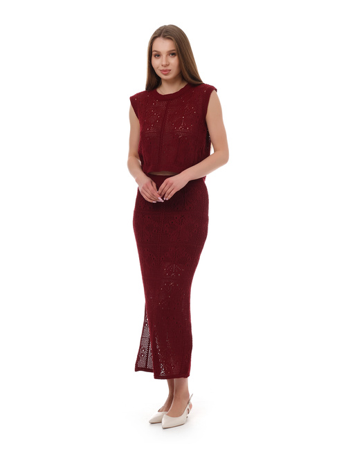 Распродажа женского бордового прямого и с юбкой комплекта одежды с круглым вырезом и разрезом но без рукавов выполнен в стиле Casual из коллекции бренда EQUILIBRI весна-лето 2025.