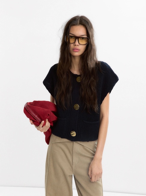 Новинка женского синего прямого жилета с коротким рукавом и круглым вырезом выполнен в стиле Casual из коллекции бренда Parfois весна-лето 2025.