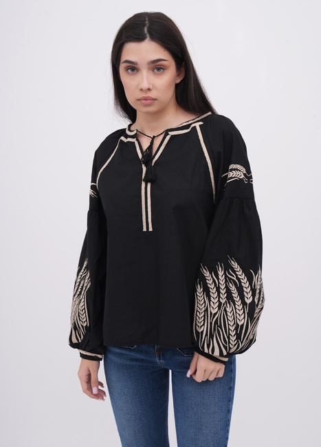 Распродажа женской черной свободной блузки с v-вырезом выполненной в стиле Этнический из коллекции бренда EQUILIBRI осень-зима 2025.